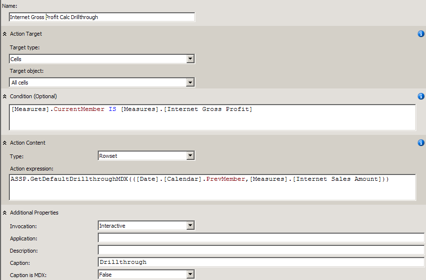 [Measures].CurrentMember IS [Measures].[Internet Gross Profit[. See below to theGetMeasureGroupCalculatedMeasuresfunction for another example of a Condition expression. - “Action Type” needs to be set to “Rowset”